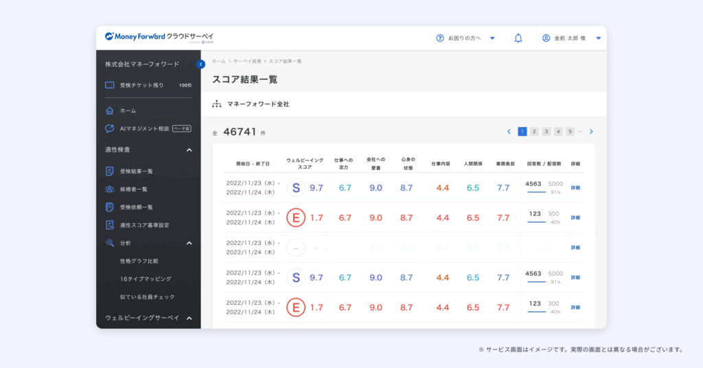 『マネーフォワード クラウドサーベイ』は、性格の違いによる回答傾向や前回の回答結果との差分を踏まえて、従業員の心理状態や離職リスクを早期発見・防止するサービスである。一人一人の状態を正しく把握し、特に優先してケアすべき従業員をアラートするため、「今ケアを必要としている従業員」がひと目で分かる。