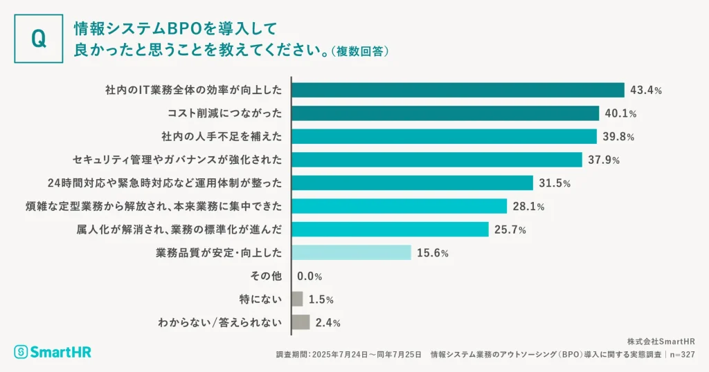「情報システムBPOを導入して良かったと思うことを教えてください。(複数回答)」と質問したところ、「社内のIT業務全体の効率が向上した」が43.4%で最も多く、次いで「コスト削減につながった」が40.1%、「社内の人手不足を補えた」が39.8%という回答となった。