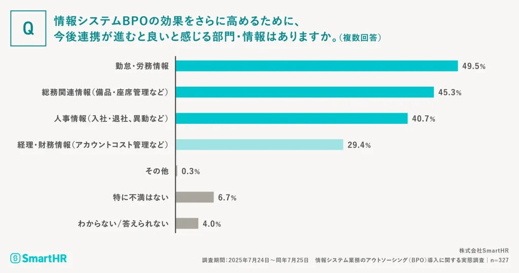 「情報システムBPOの効果をさらに高めるために、今後連携が進むと良いと感じる部門・情報はありますか。(複数回答)」と質問したところ、「勤怠・労務情報」が49.5%、「総務関連情報(備品・座席管理など)」が45.3%、「人事情報(入社・退社、異動など)」が40.7%という回答となった。