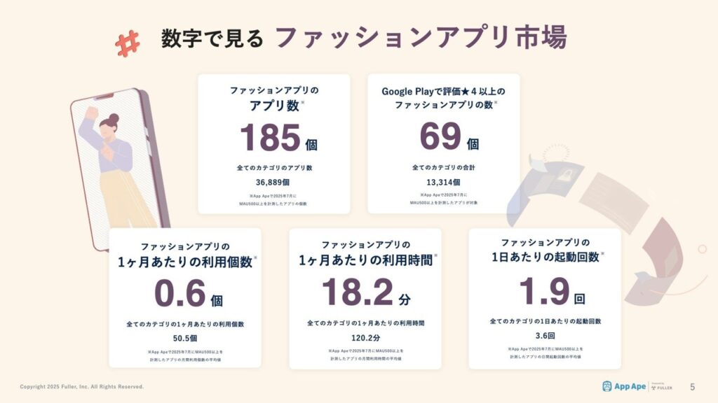 2025年7月時点でファッションアプリは185個。全アプリ36,889個のうち約0.5%を占めた。