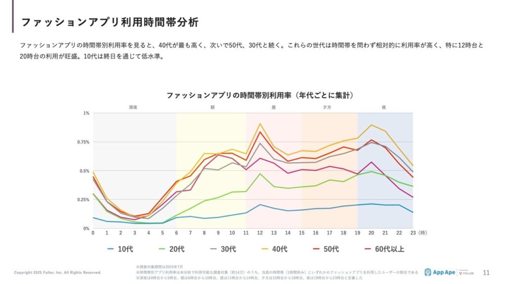 ファッションアプリの時間帯別利用率を見ると、40代が最も高い利用率を示し、次いで50代・30代が続いた。全体としては昼(12時台)と夜(20時台)に利用が集中する傾向だ。