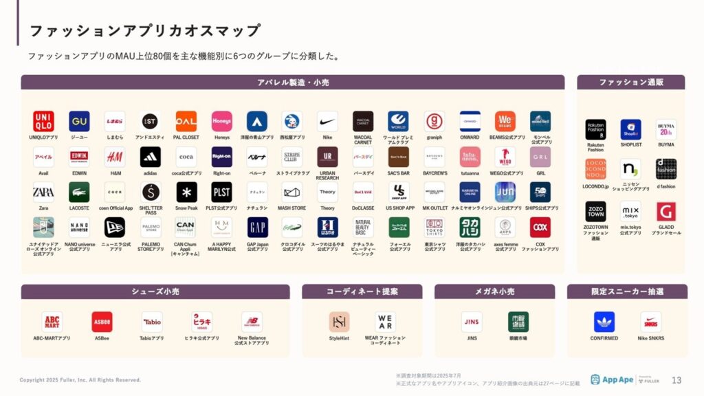 MAU上位80アプリを対象に6つのグループ(アパレル製造・小売、ファッション通販、シューズ小売、コーディネート提案、メガネ小売、限定スニーカー抽選)に分類。ZOZOTOWN、UNIQLO、ジーユー、WEARなど、ブランド公式からEC系まで多様なアプリが並び、ファッション市場の広がりが確認された。