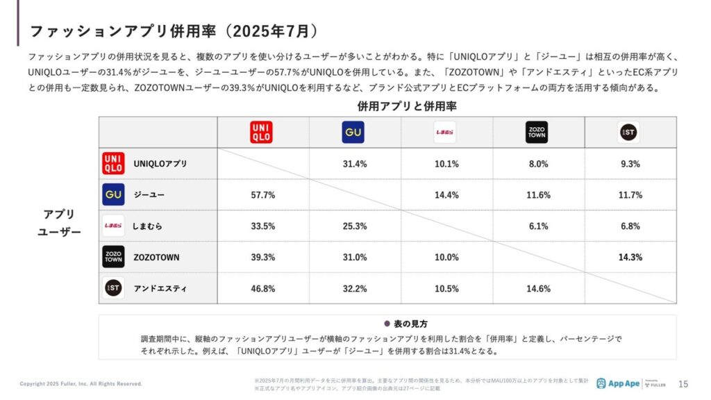ファッションアプリの併用状況を見ると、UNIQLOアプリとジーユーアプリの併用率が高く、UNIQLOユーザーの31.4%がジーユーアプリを利用し、ジーユーユーザーの57.7%がUNIQLOアプリを併用していた。