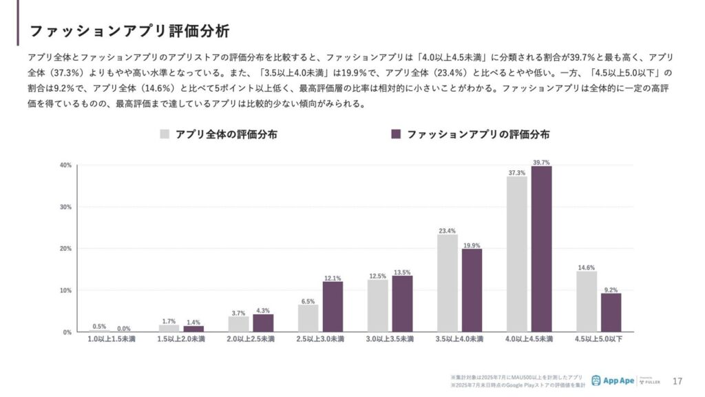 ファッションアプリの評価分布では、「4.0以上4.5未満」が最も多く39.7%だった。全体平均(37.3%)よりやや高い水準で、安定した高評価を得ている。