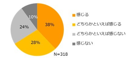 派遣で就業中の318名に「あなたの職場ではデジタル化が進んでいると感じますか?」と伺うと66%が「感じる」(感じる:38%、どちらかといえば感じる:28%)と回答した。