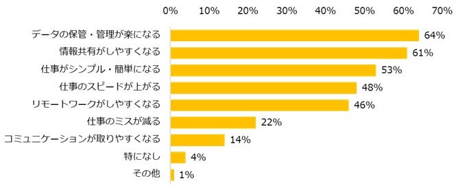 デジタル化が進んでいると「感じる」「どちらかといえば感じる」と回答した方に、どのようなデジタル化が進んでいるかを伺うと、トップは「ペーパーレス化」(81%)だった。続けて、デジタル化のメリットについて質問すると、上位は「データの保管・管理が楽になる」(64%)、「情報共有がしやすくなる」(61%)だった。