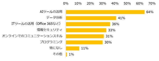 続けて、デジタル化に対応するために、今後身につけたいスキルや知識を伺うと、上位は「AIツールの活用」(64%)、「データ分析」(41%)だった。