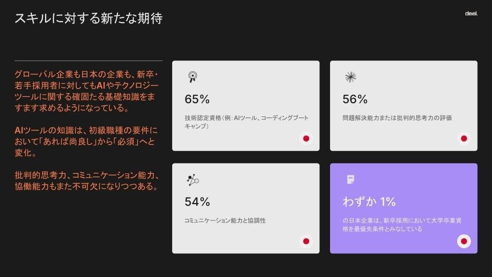 求められるスキルの変化:日本企業は新卒・若手採用で「技術認定(65%)」「問題解決力・批判的思考力(56%)」「コミュニケーション力・協働力(54%)」を重視。大学の学位を必須要件とする企業は日本でわずか1%。