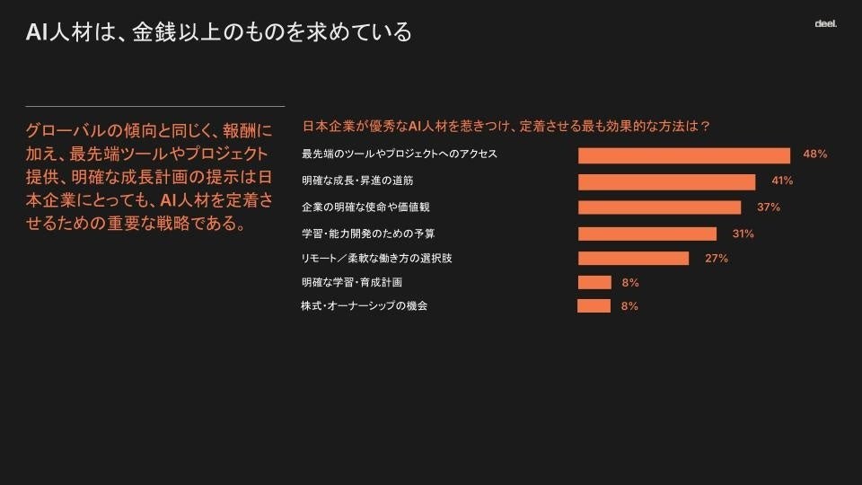 AI人材の競争: 日本では44%がトップAI人材に25%以上高い給与を提示。さらに、人材の獲得・維持のため48%が「最先端ツールへのアクセス」、41%が「明確なキャリアパス」を提供。