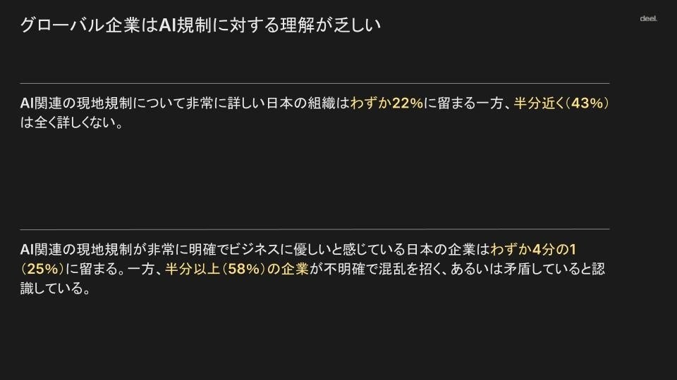 AIガバナンス:日本では、国内のAI規制に「非常に熟知している」企業はわずか21%。一方で、従業員のAIツール使用を指導する正式なポリシー導入率は30%と他市場よりも高い。