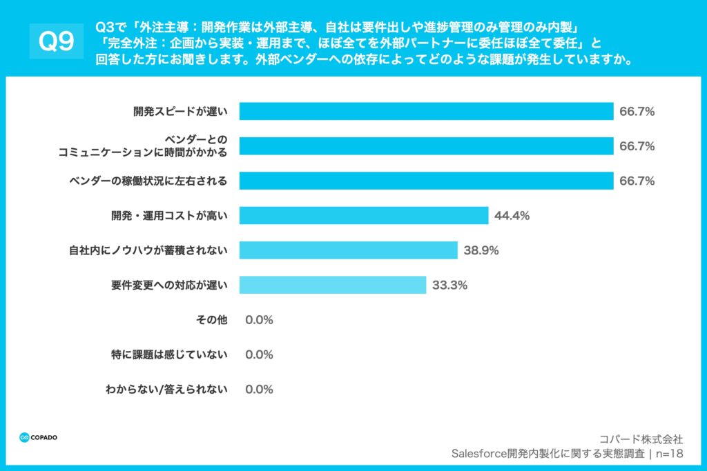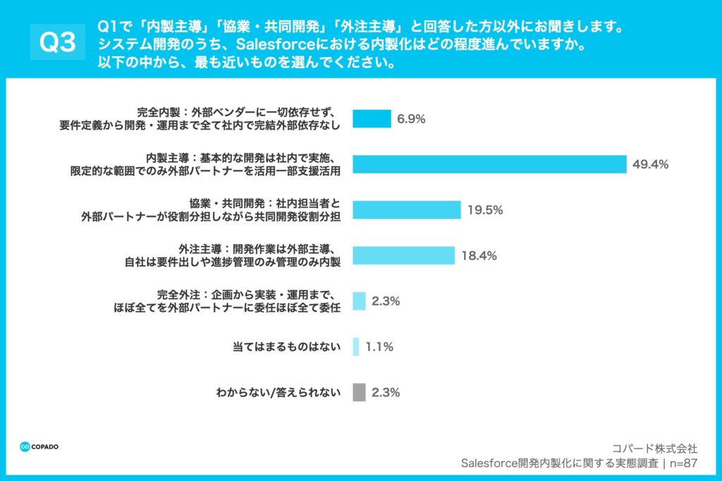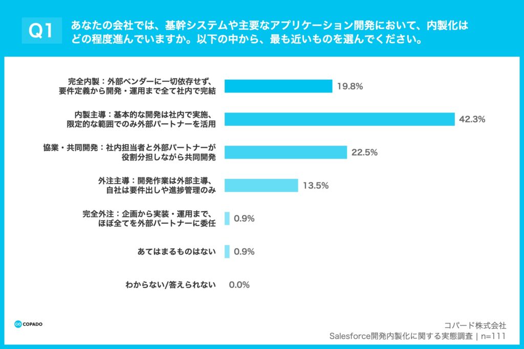 コパード株式会社は、Salesforce導入企業の情報システム部門・DX推進部門において、Salesforceの開発・運用業務に携わる担当者111名を対象に、Salesforce開発・運用の内製化に関する実態調査を実施した。