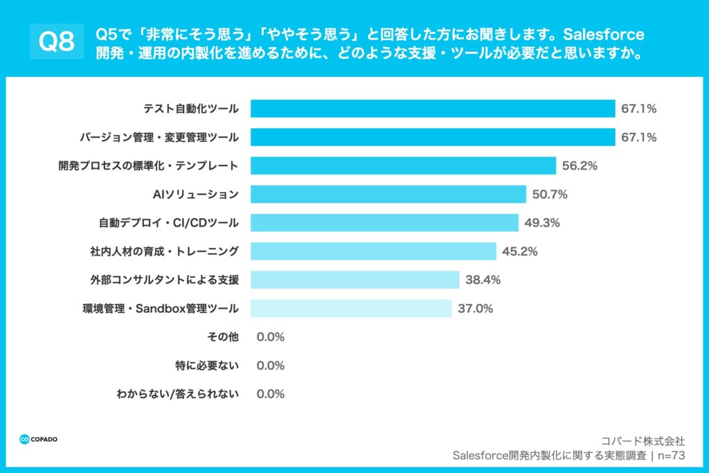 Salesforce開発・運用 内製化に必要な支援、「テスト自動化ツール」「バージョン管理・変更管理ツール」が67.1%で同率1位