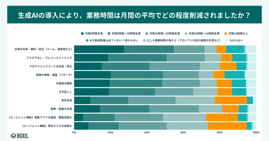 しかし、生成AIを「文章作成・要約・校正」のみで活用した場合、月40時間以上の削減を達成している企業は5.3%に留まる。一方で、特定のタスクを自律的に実行させる「AIエージェント」として活用している企業は、21.1%が月40時間以上の削減を達成している。