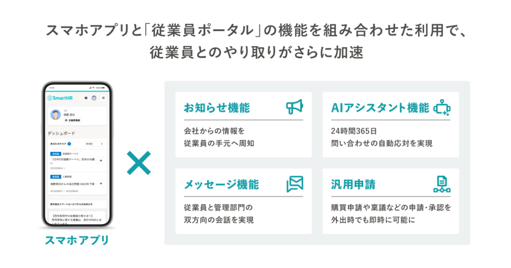 スマホアプリは、「従業員ポータル」の機能と組み合わせて利用することで、業務効率化に大きく貢献する。