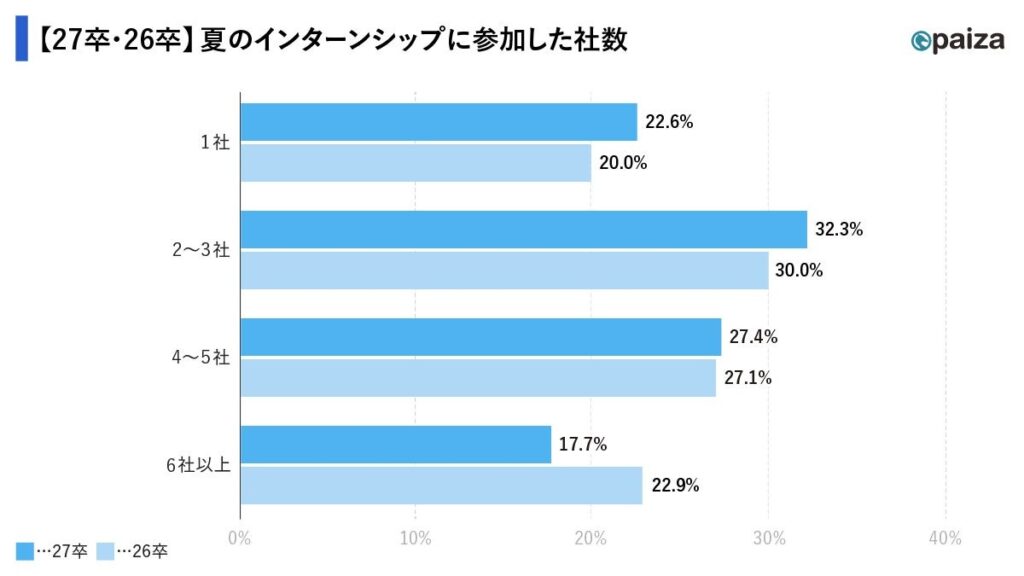 夏インターンの参加社数を前年と比較すると、「6社以上」と回答した多量参加層の割合が減少している。一方で「2〜3社」といったボリュームゾーンは維持されている。