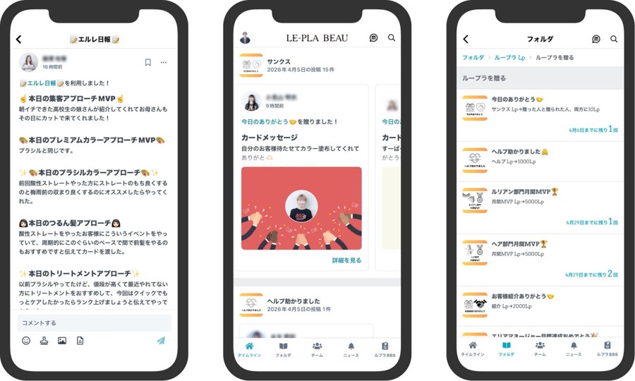 株式会社ルプラボウでは、正社員や時短社員に加え、美容学生のアルバイトなど多様なスタッフが各店舗で勤務している。従来、店舗間の連絡は個人のSNSに依存しており、情報の散在やプライベートとの境界線が課題となっていた。